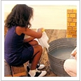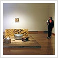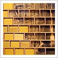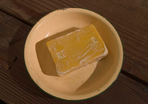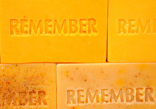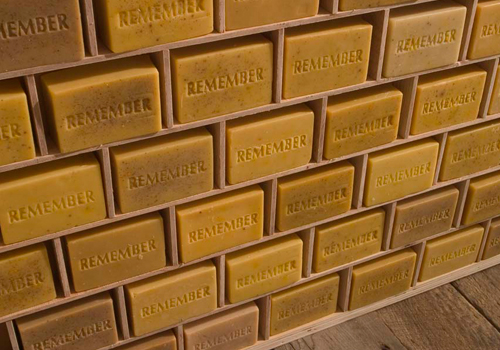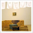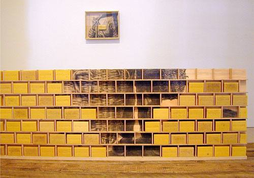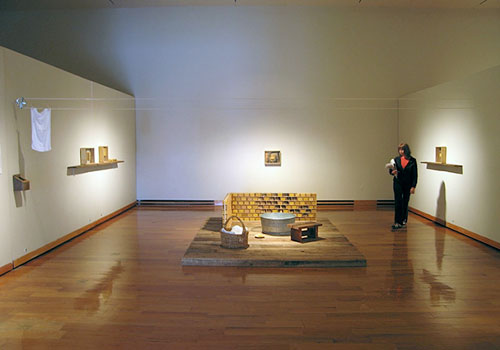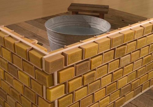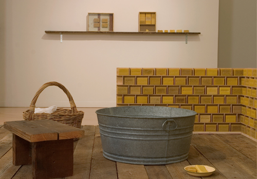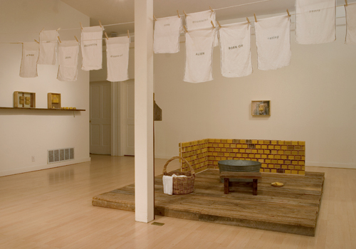 "changes & disappearances" is about the forgotten 19th c. Chinese railroad and mine workers in Idaho. 400 bars of soap, each stamped with the word "REMEMBER," form a wall. Viewers use the soap to wash towels imprinted with words of memories and official status. Washing eventually erases both the "REMEMBER" and memory words. As the soap bars are removed, a charcoal drawing based on a historical image of a Chinese laborer is revealed. Interactive mixed media installation: soap, water, wash tub, towels, charcoal on wood; glass; historical barn wood; clothesline, clothespins; wicker basket; dimensions variable. Sun Valley Art Center, Ketchum, ID; 2004.
