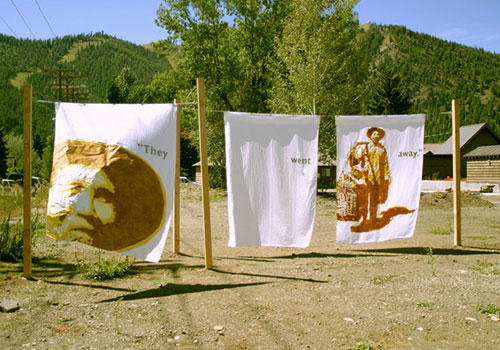 In an outdoor component of the installation, "they went away," bed sheets were painted in a concoction of soy sauce, seaweed and green tea with images of a 19th c Chinese migrant worker and installed at the entry to town on Main Street, Ketchum, ID. Over time the images disappeared, leaving only the words "they" "went" "away". The sheets were produced in a community workshop. Site specific installation; cotton sheets, soy sauce, green tea, seaweed powder, clothes line, clothes pins, wood; dimensions variable.